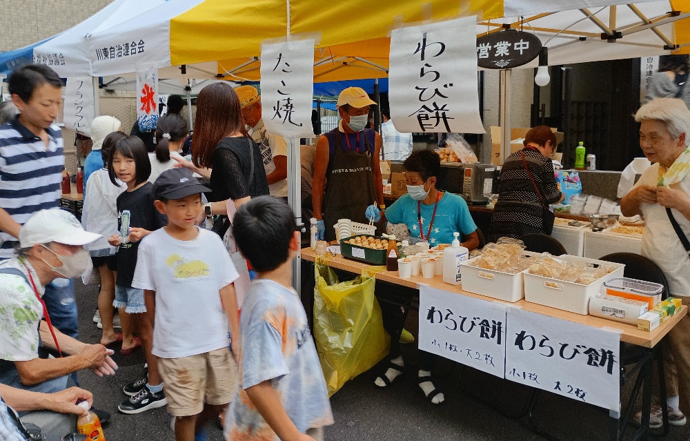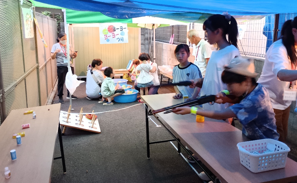 焼きそば、たこ焼き、フランクフルト、わらび餅、かき氷、ビール・ジュース、ワクワク駄菓子(仮称)、ヨーヨー釣り、輪投げ、射的、モグラ叩き、折り紙、ペンシルバルーン、ボードゲーム、エココーナー、消防団コーナー